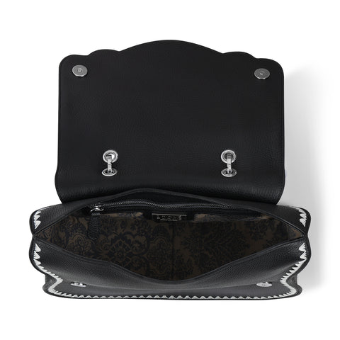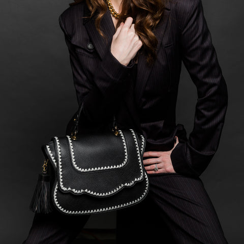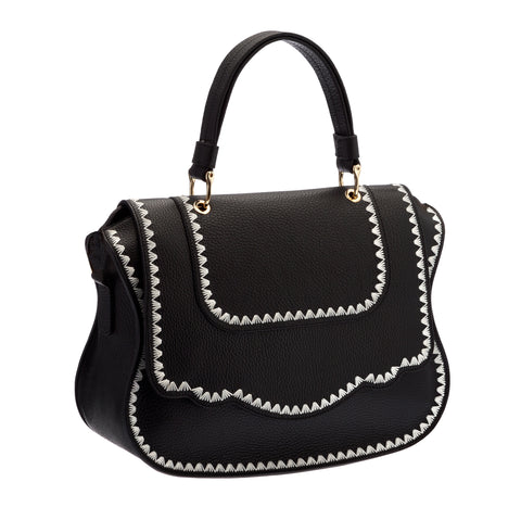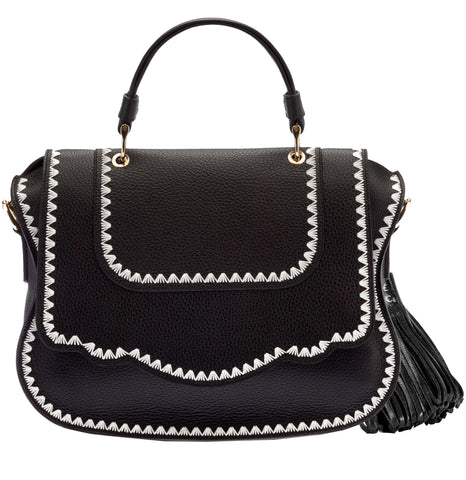 Designed after the classic Audrey handbag, this black satchel purse features a signature curved flap, highlighted with beautiful tulip contrast stitching.