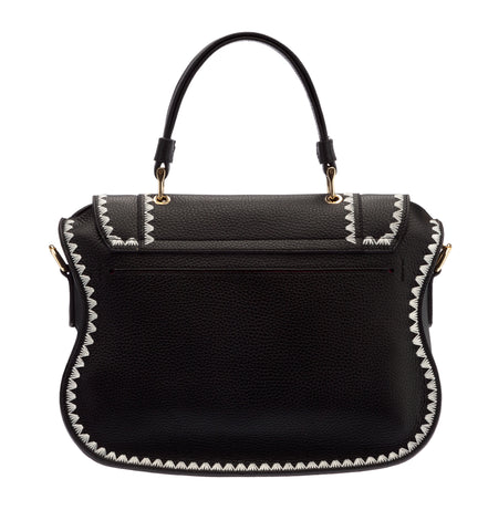 BACKORDERAudrey Satchel: Black Designer Handbag with White Stitching & Gold Hardware