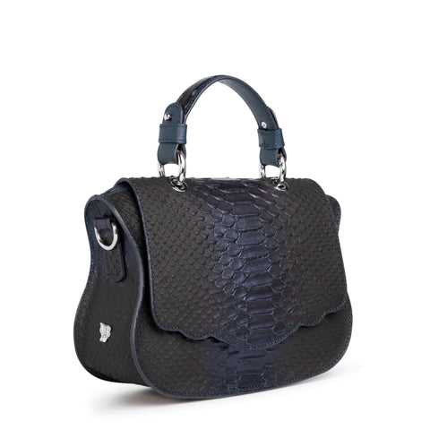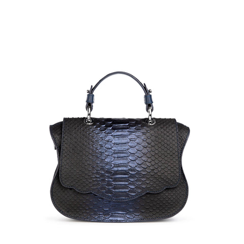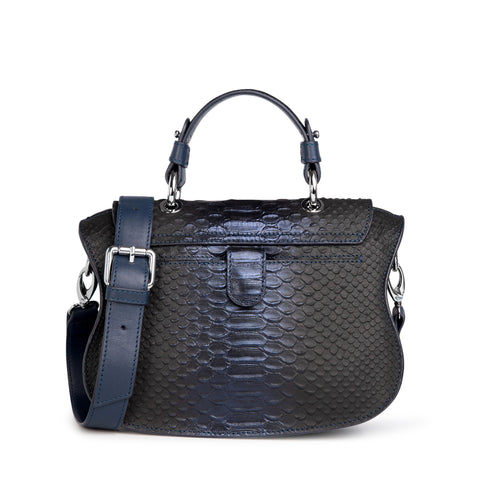 The midnight blue embossed leather makes this an instant statement bag. These metallic colors and feminine curved construction makes this luxury handbag perfect for any occasion.