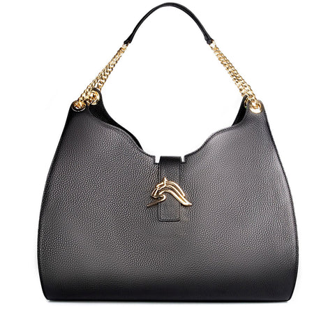 The understated Empire Cheetah Hobo bag in black leather is the ideal everyday designer shoulder bag. The matte black color showcases a classic and effortlessly chic feel and is enhanced with the addition of gold chain to the strap and logo-branded hardware on the front lock.