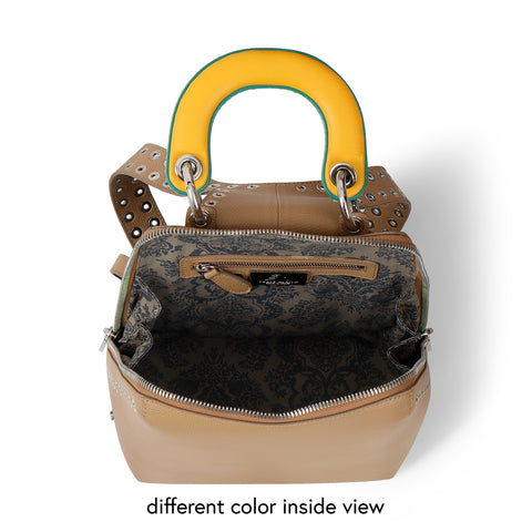 This metallic gold leather backpack features a modern shape, roomy interior, and gunmetal-toned hardware. We've also added wide, adjustable racerback straps in smooth, brown leather and a cushioned back to enhance the comfort quotient of this small designer backpack.